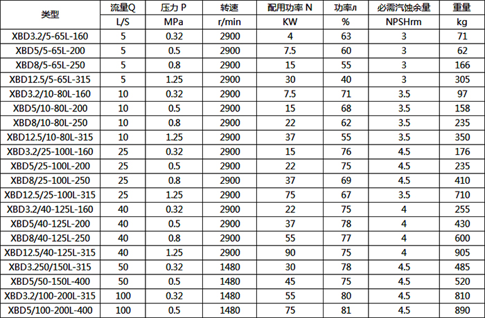 XBD-DL型消防泵主要性能參數(shù)表